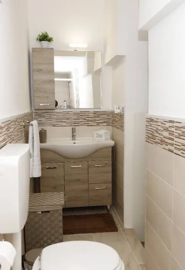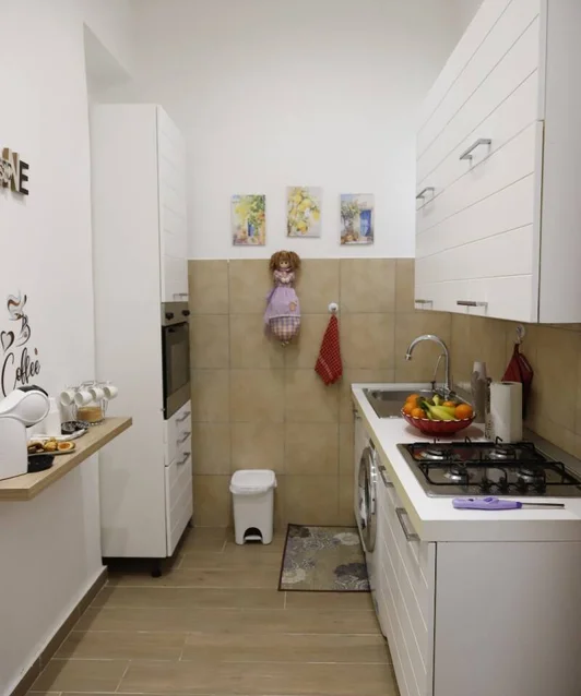 La presenza della lavatrice offre un comfort in più, soprattutto per chi soggiorna più a lungo, mentre aspirapolvere e materiali per le pulizie permettono di mantenere lo spazio sempre ordinato. Il frigorifero completa l’ambiente, pronto ad accogliere ingredienti, spuntini e tutto ciò che rende un soggiorno davvero personale.